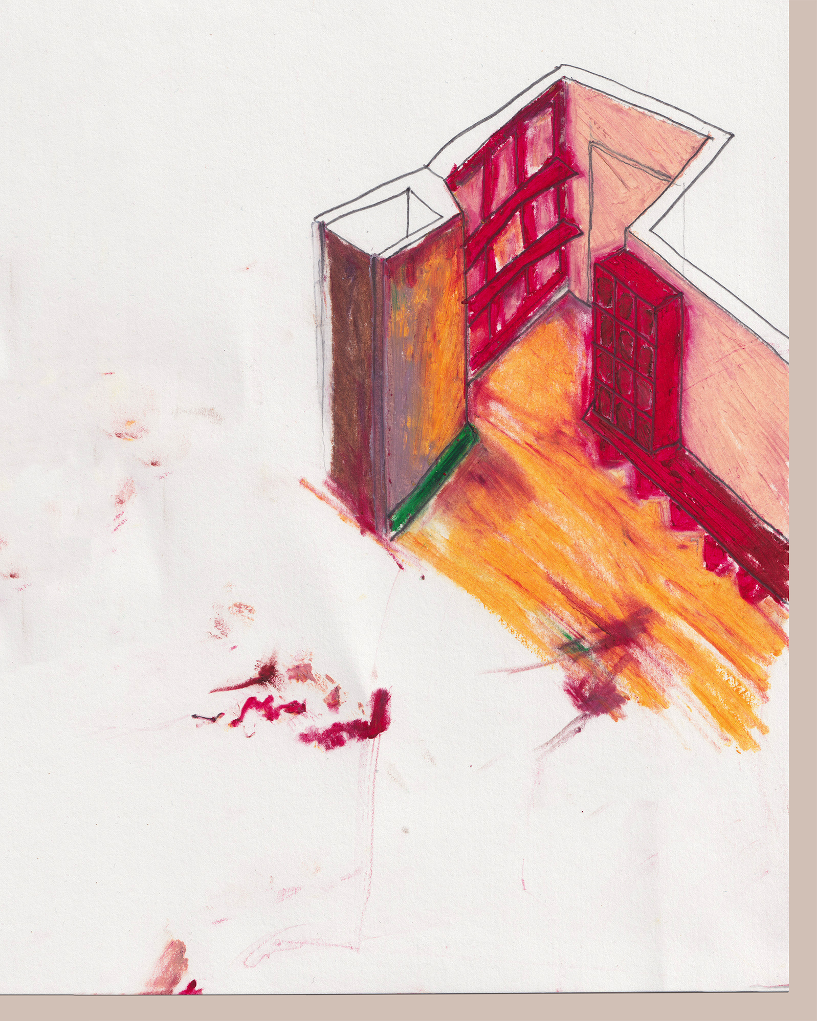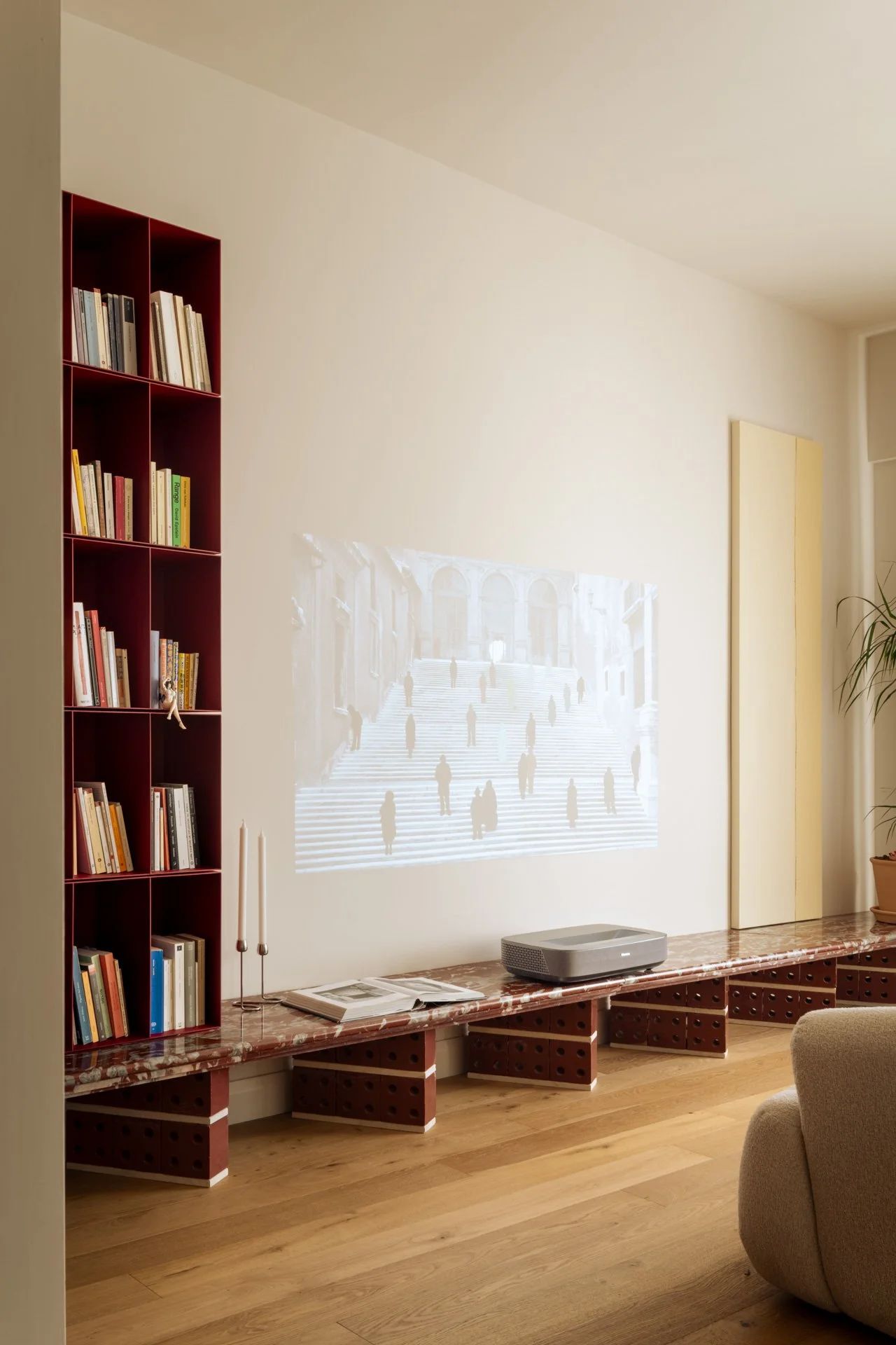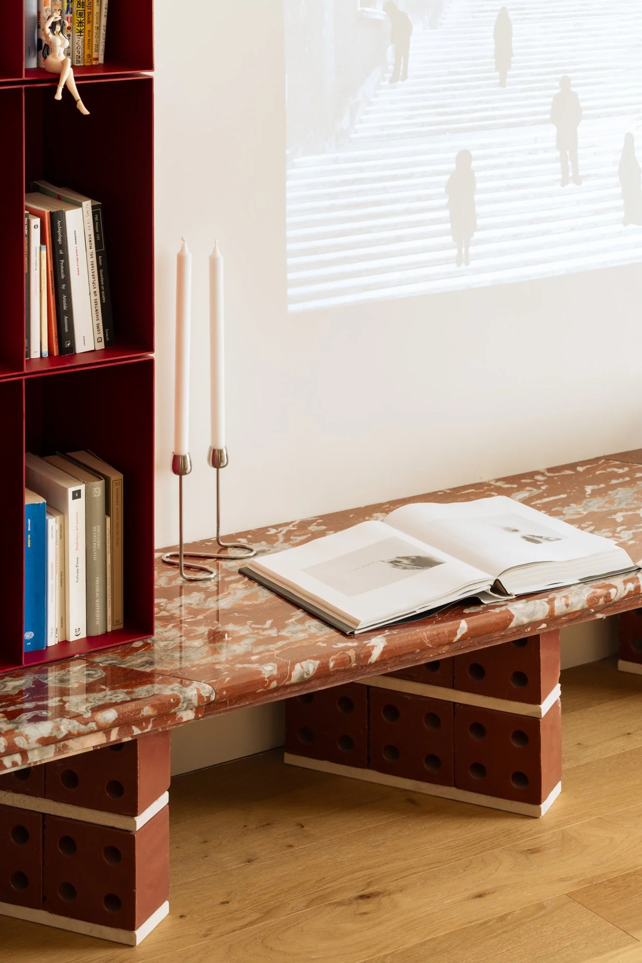 A dare il tono giocoso del living è una panca in marmo rosso Francia, appoggiata su un sandwich di blocchi in ceramica red glossy lipstick e soglie di travertino recuperate.