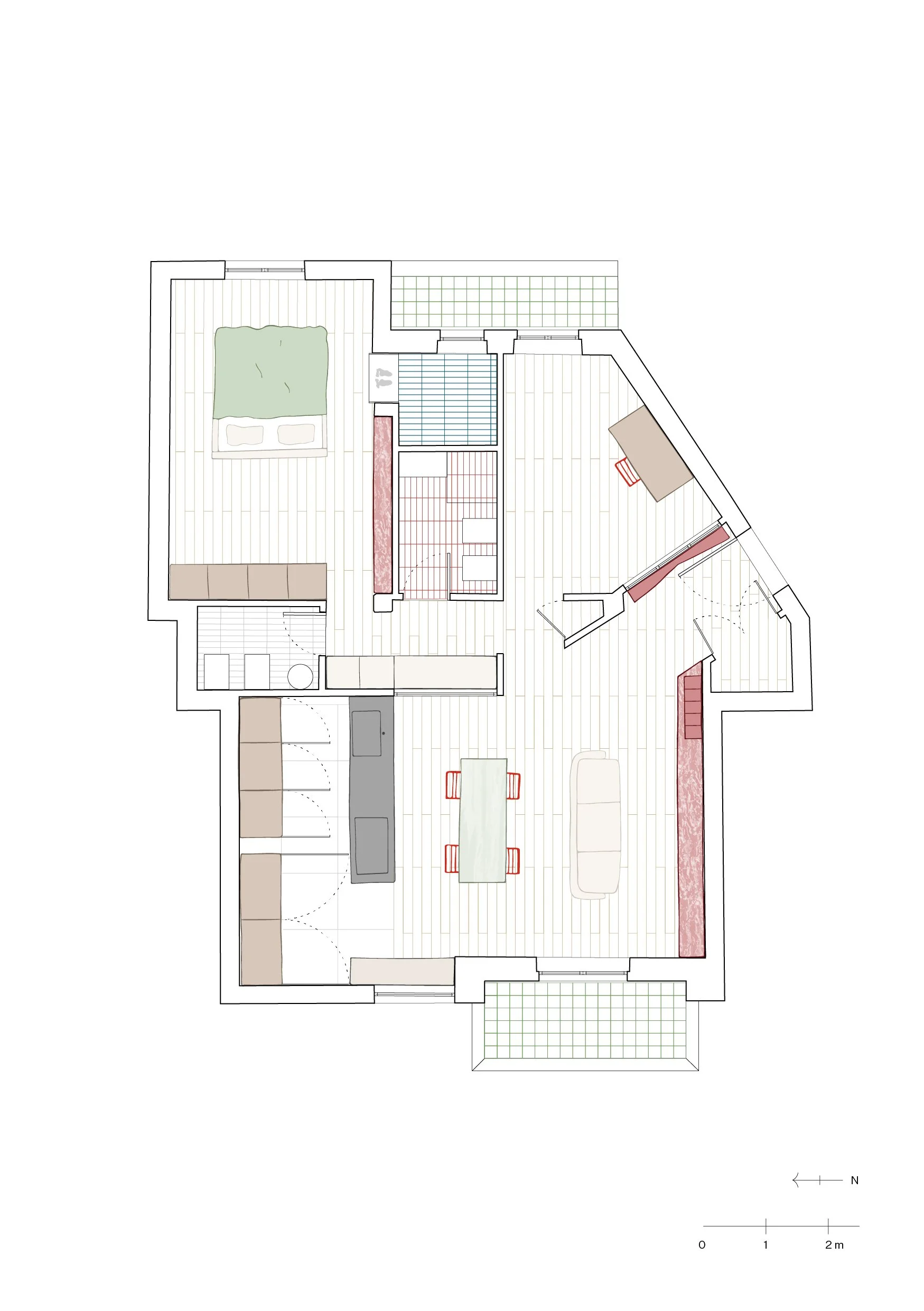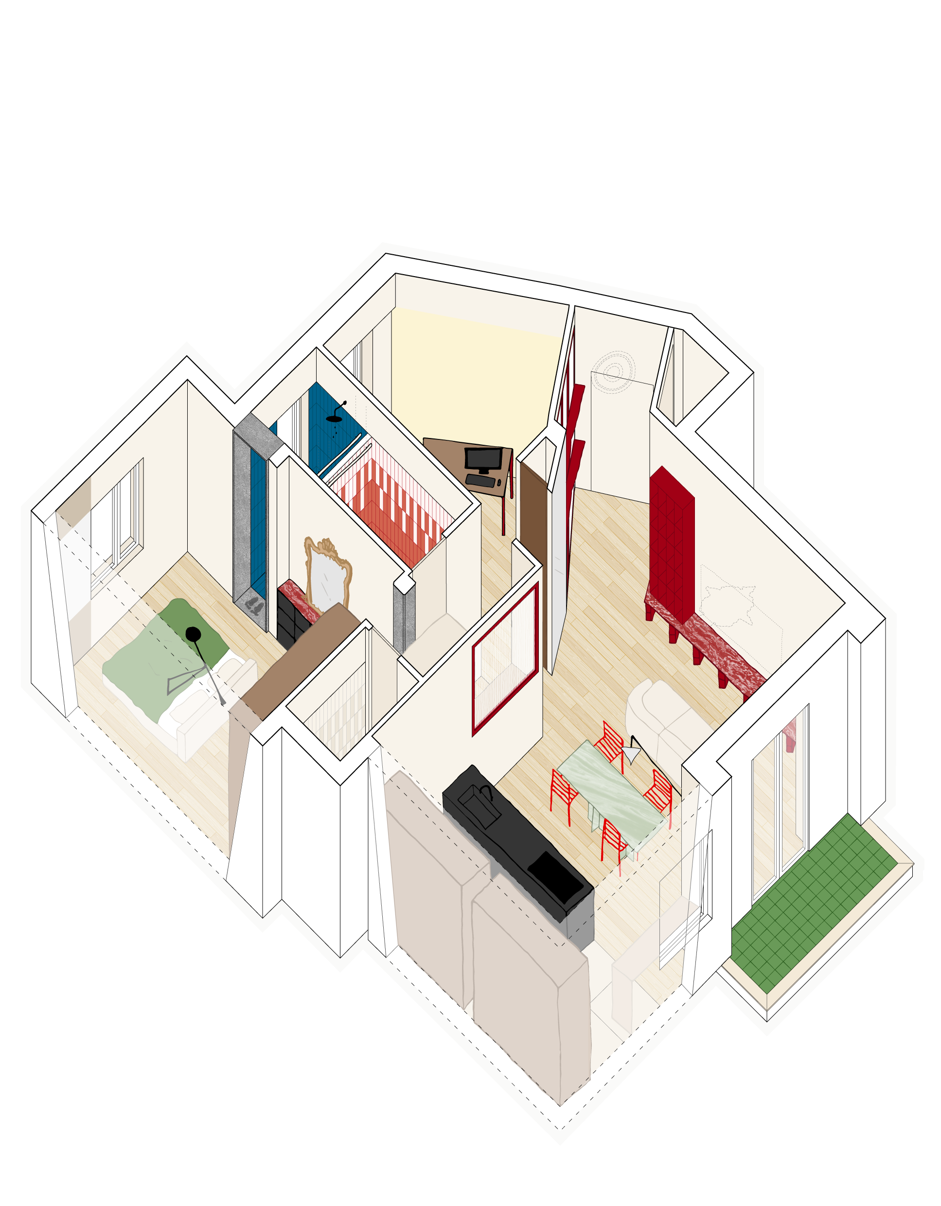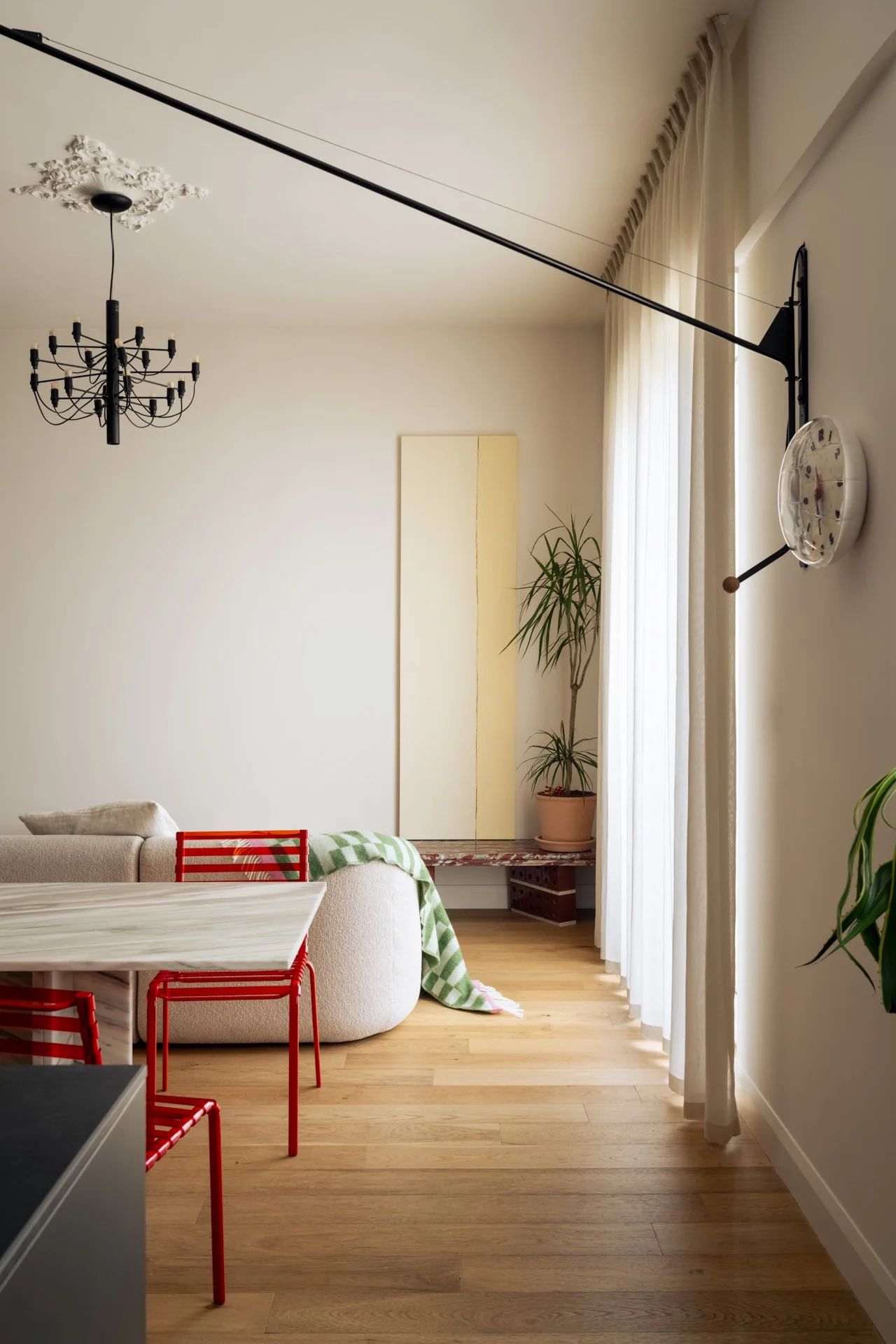 L'appartamento, dentro un edificio modernista già generoso nei rapporti aero-illuminanti, non aveva bisogno di aggiungere finestre: aveva bisogno di essere liberato. Abbiamo eliminato le partizioni ingombranti e aperto una sequenza di setti e vetrate capaci di far passare la luce da est a ovest (e viceversa). La nuova distribuzione prevede porte solo per i due bagni e grandi partizioni vetrate per separare gli ambienti senza spegnere la casa. Risultato: sentirsi investiti dalla luce fin dall'ingresso.