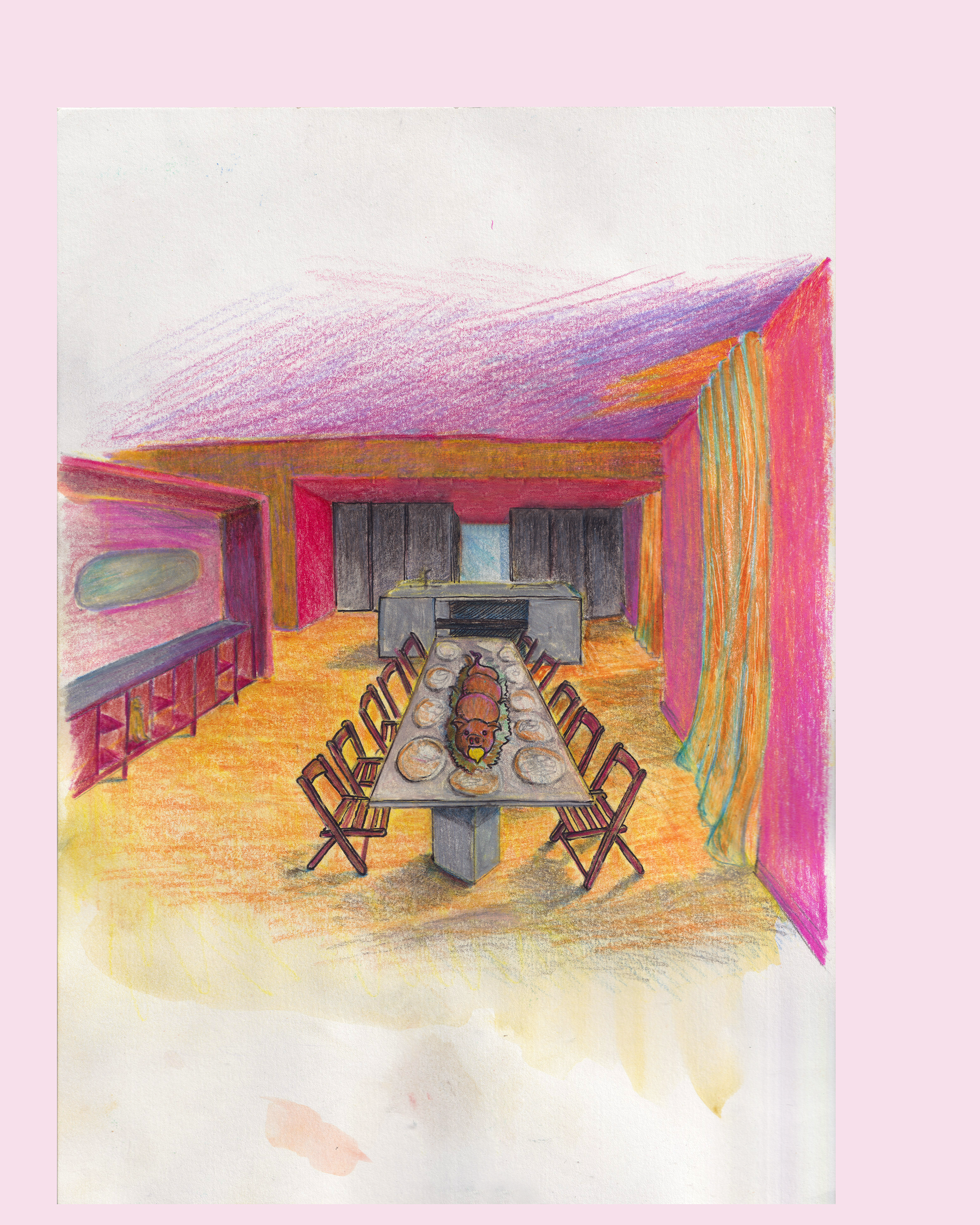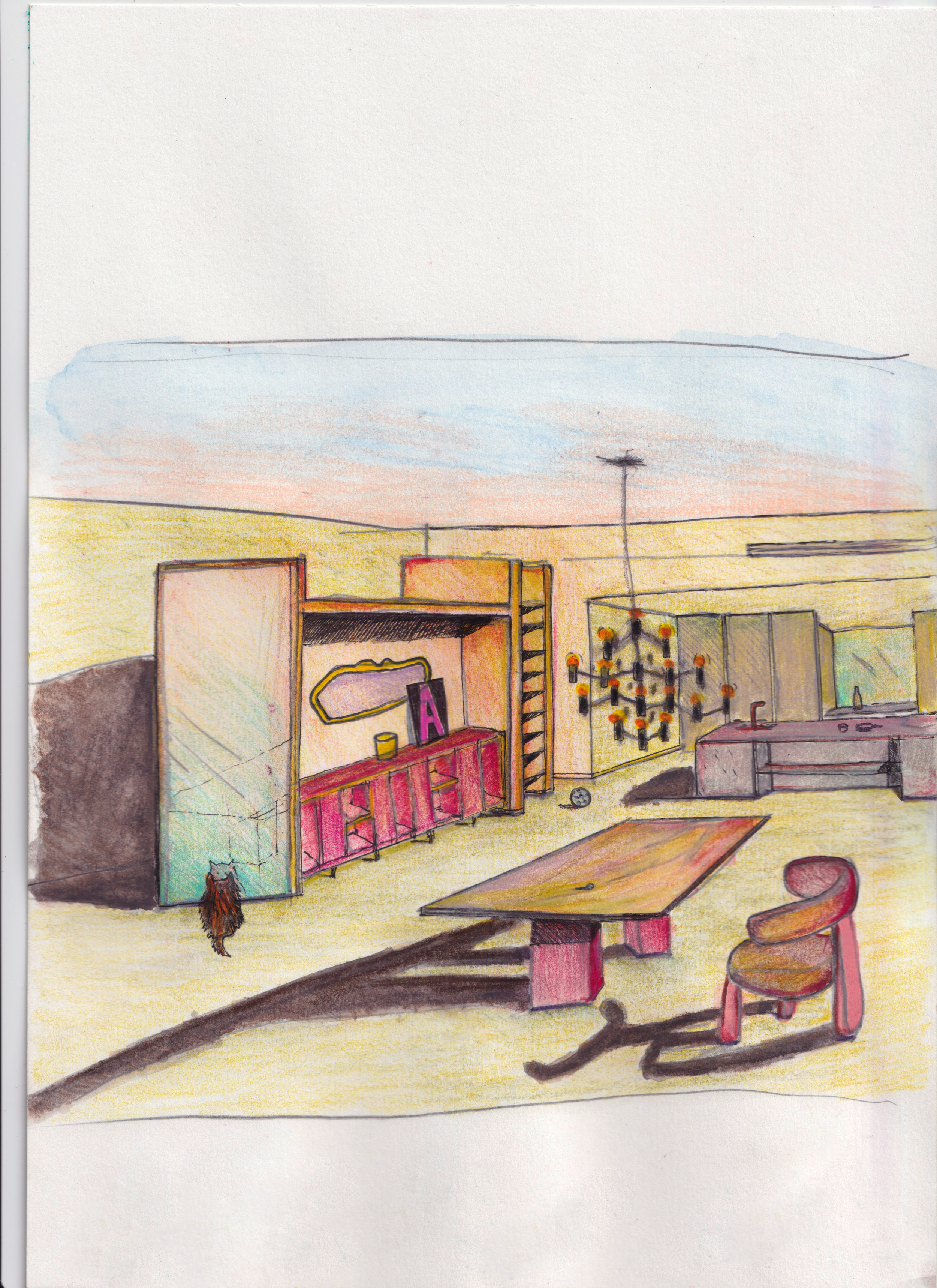 una sequenza cucina–pranzo–salone. Uno spazio unico che somiglia più a un campetto domestico dove le funzioni si –allineano– come fossero ruoli in campo, ognuno con la propria [porzione] di gioco.