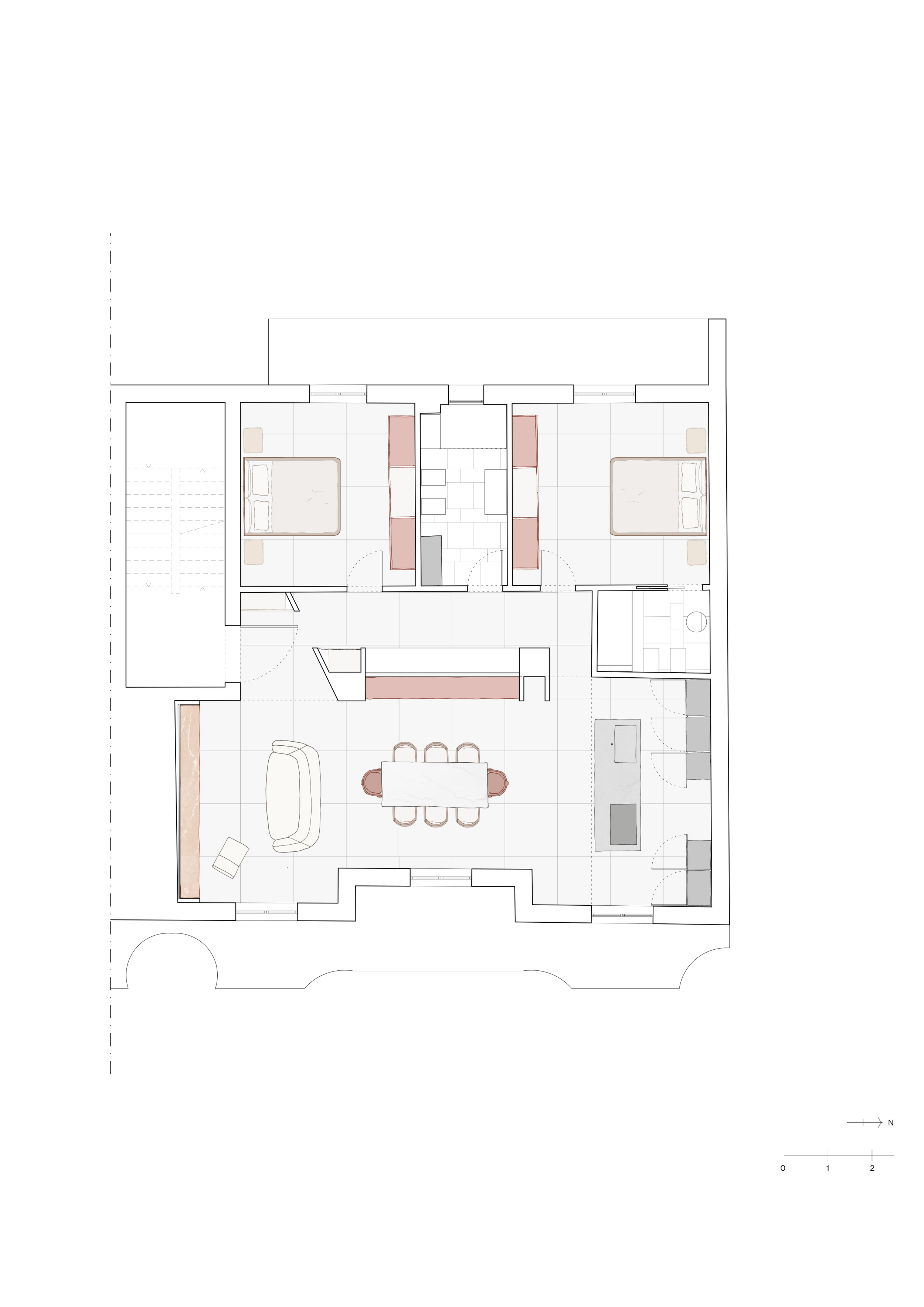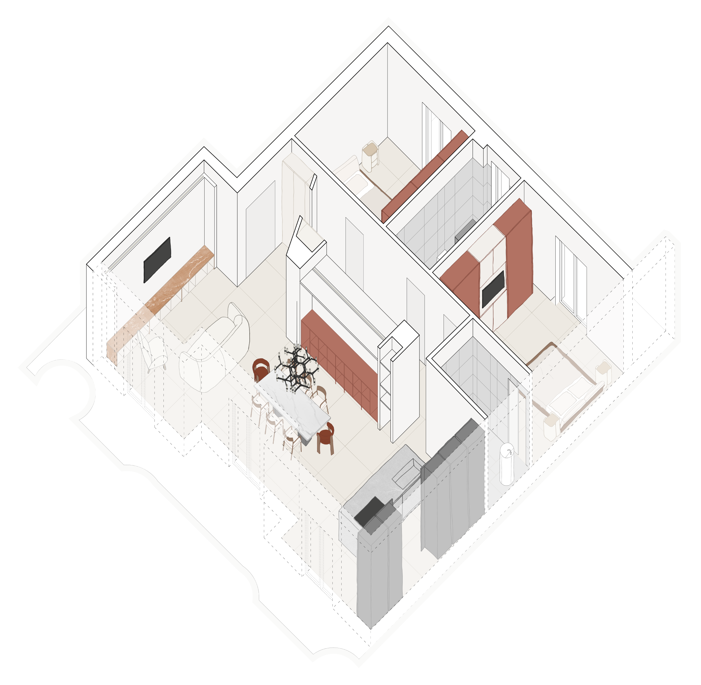 I materiali entrano come deviazioni puntuali acciaio, quarzo, un piano tavolo in marmo Calacatta e una panca Rosso Alicante.