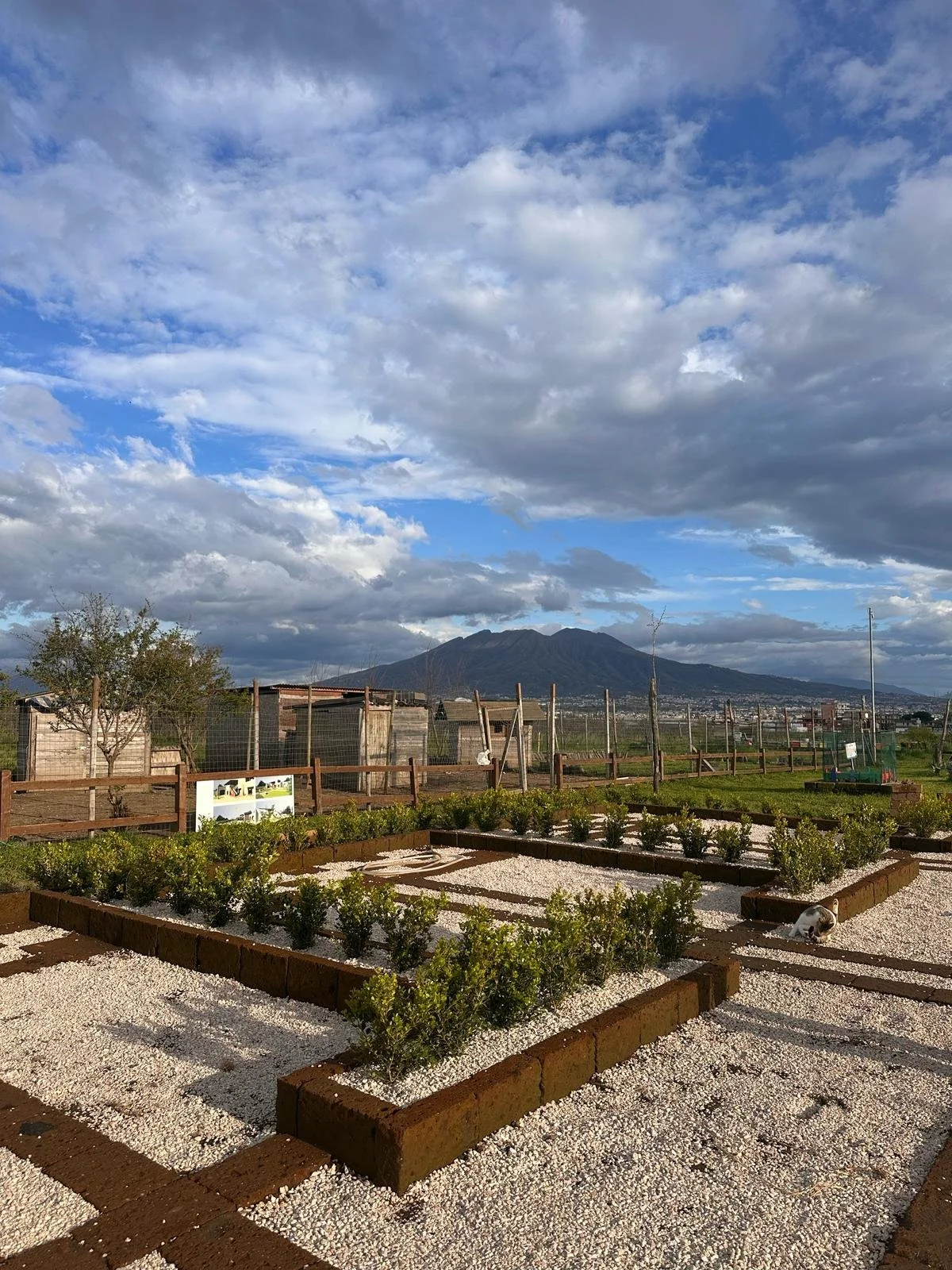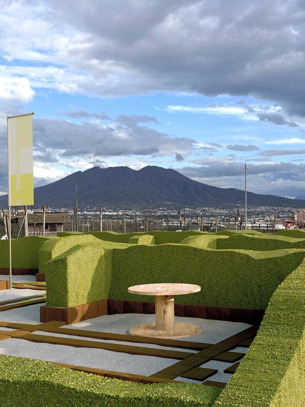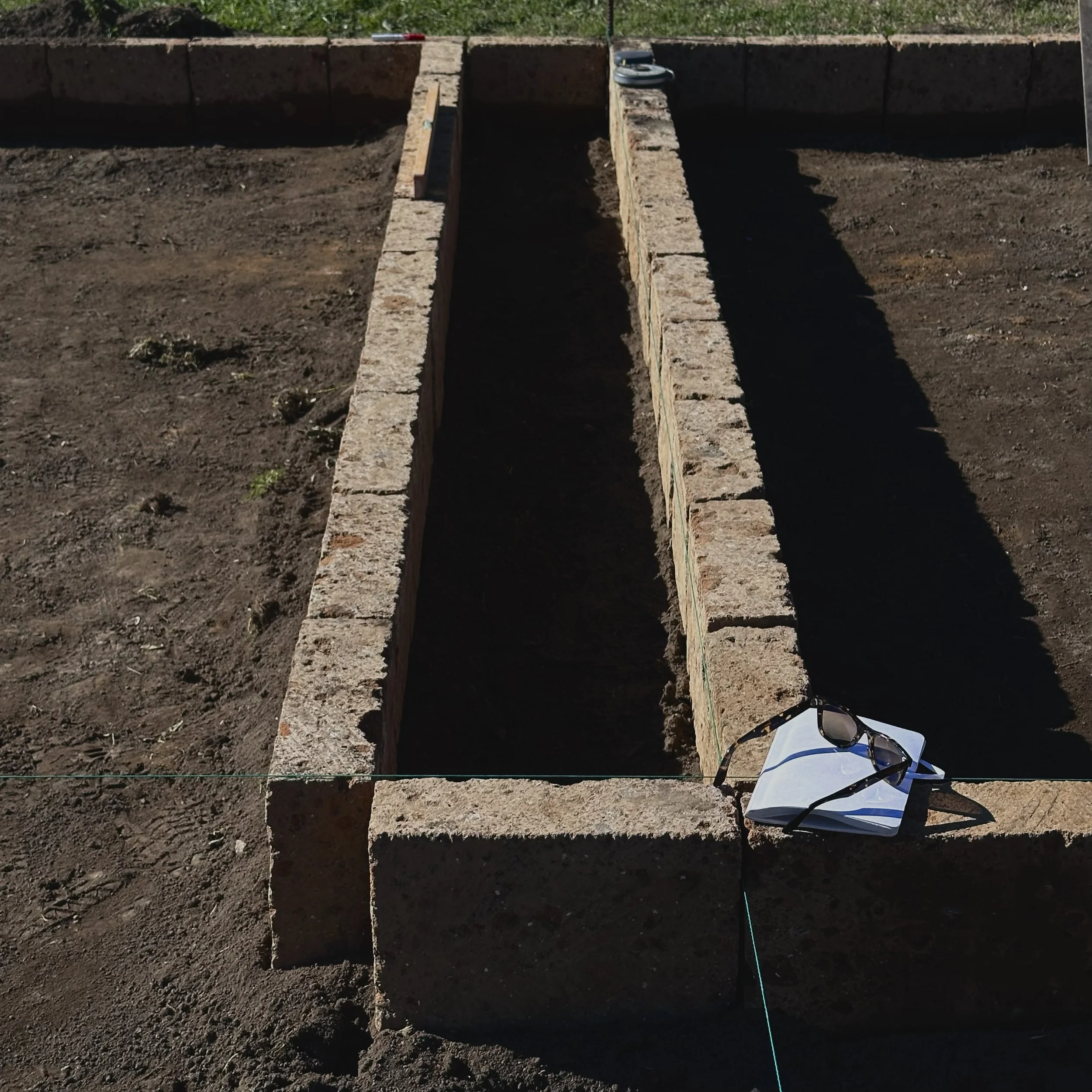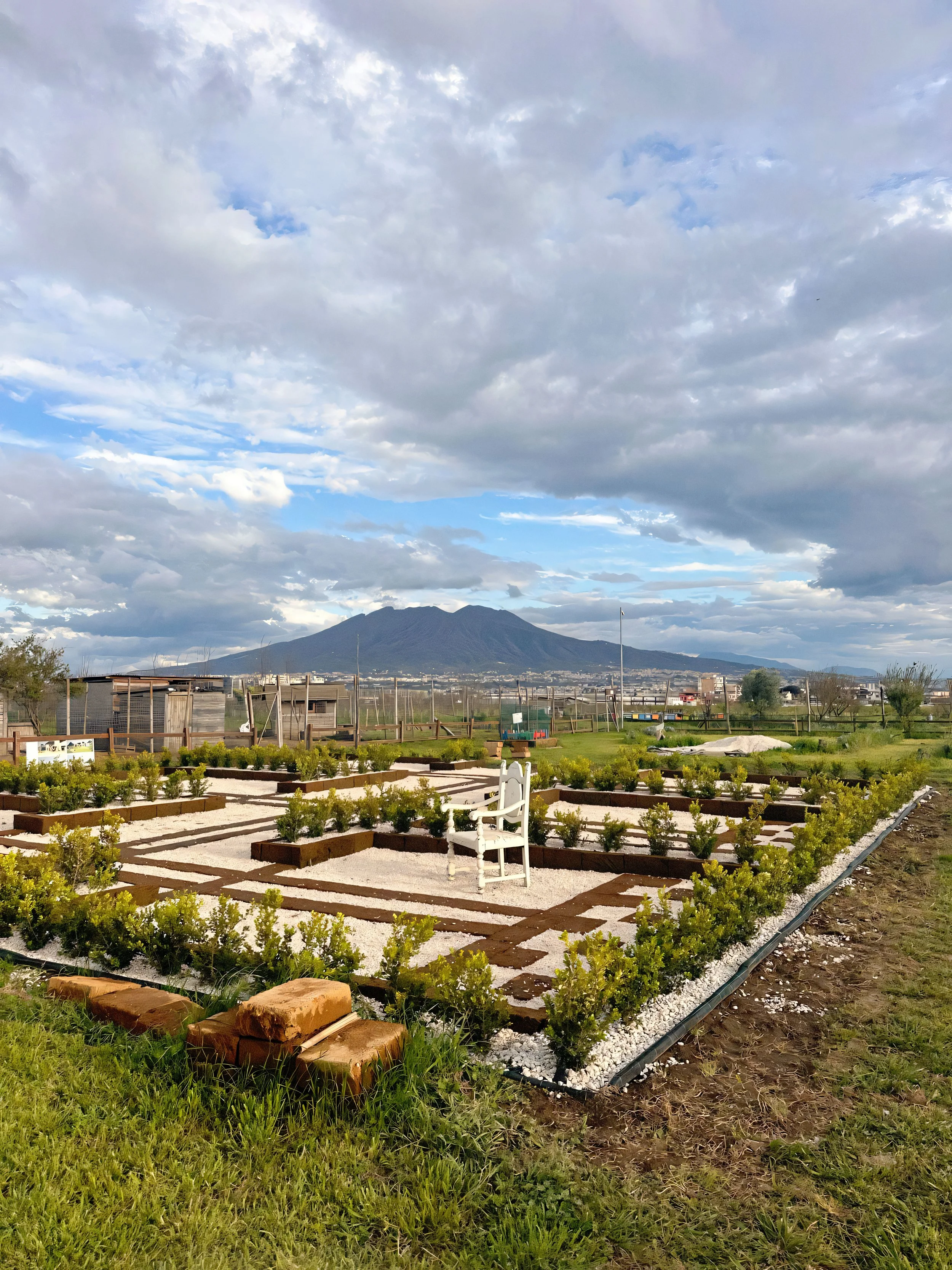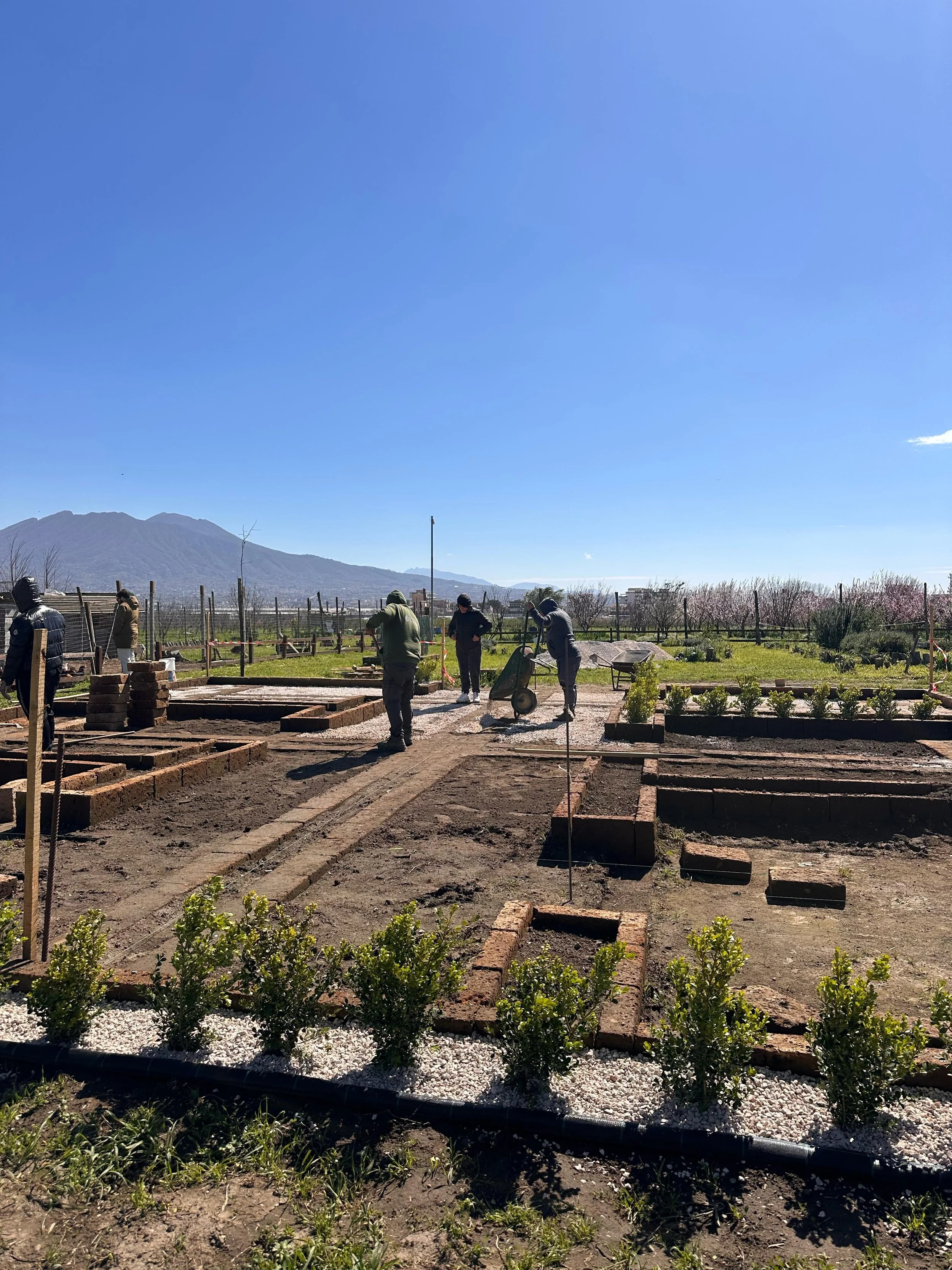Dei mattoni di tufo posati a secco fungono da tracciato, disegnando sul terreno la piú semplice delle aree, un quadrato di 12 metri per lato; allo stesso modo delineiamo sei stanze interne, tre su un fianco e altre tre dall’altro, mentre al centro un largo corridoio non solo servirá da accesso alle stesse, ma consentirá a tutti di incontrarsi come durante una allegra ora di intervallo. L’unico limite saranno i 300 buxus che proteggeranno le lezioni una volta cresciuti !