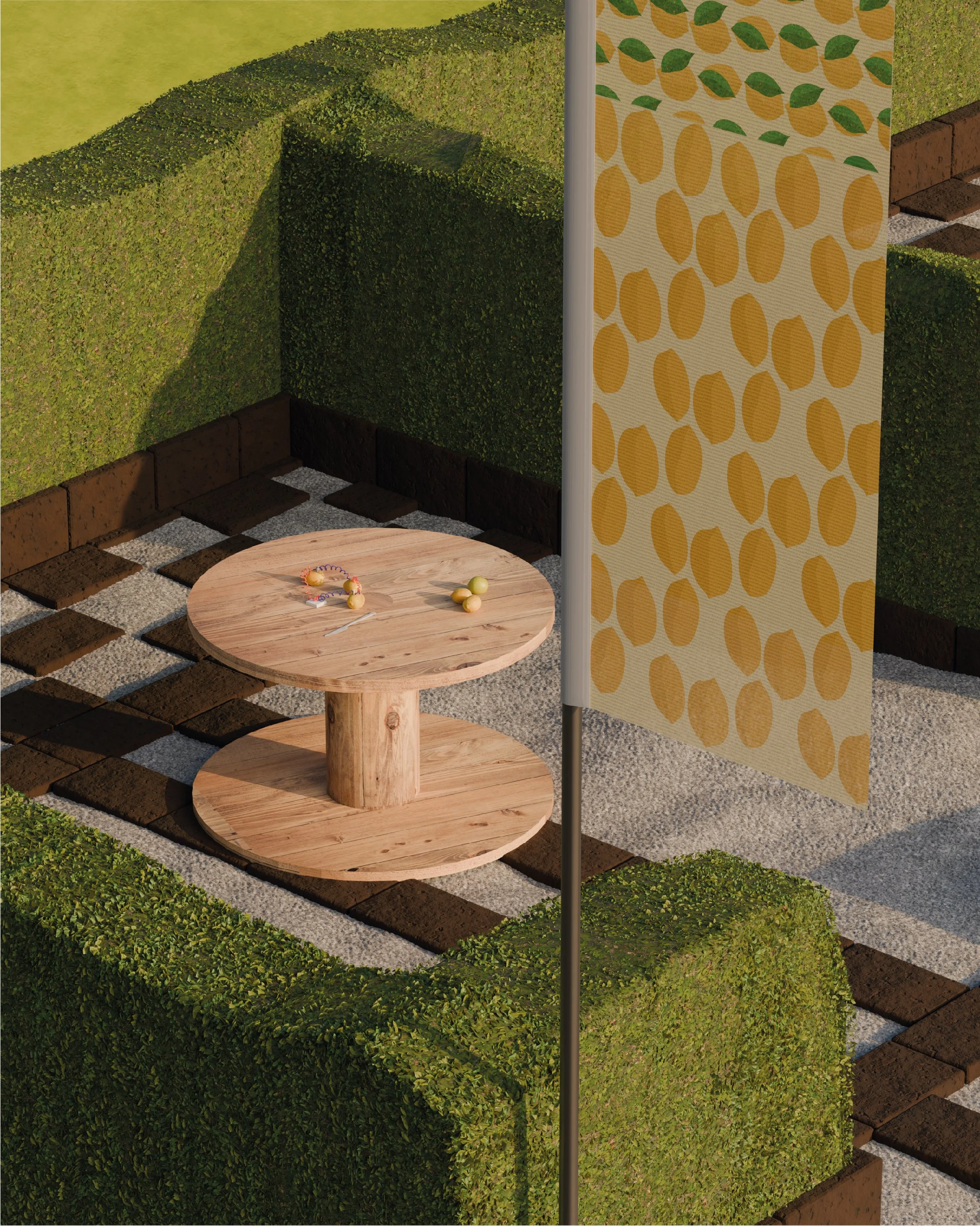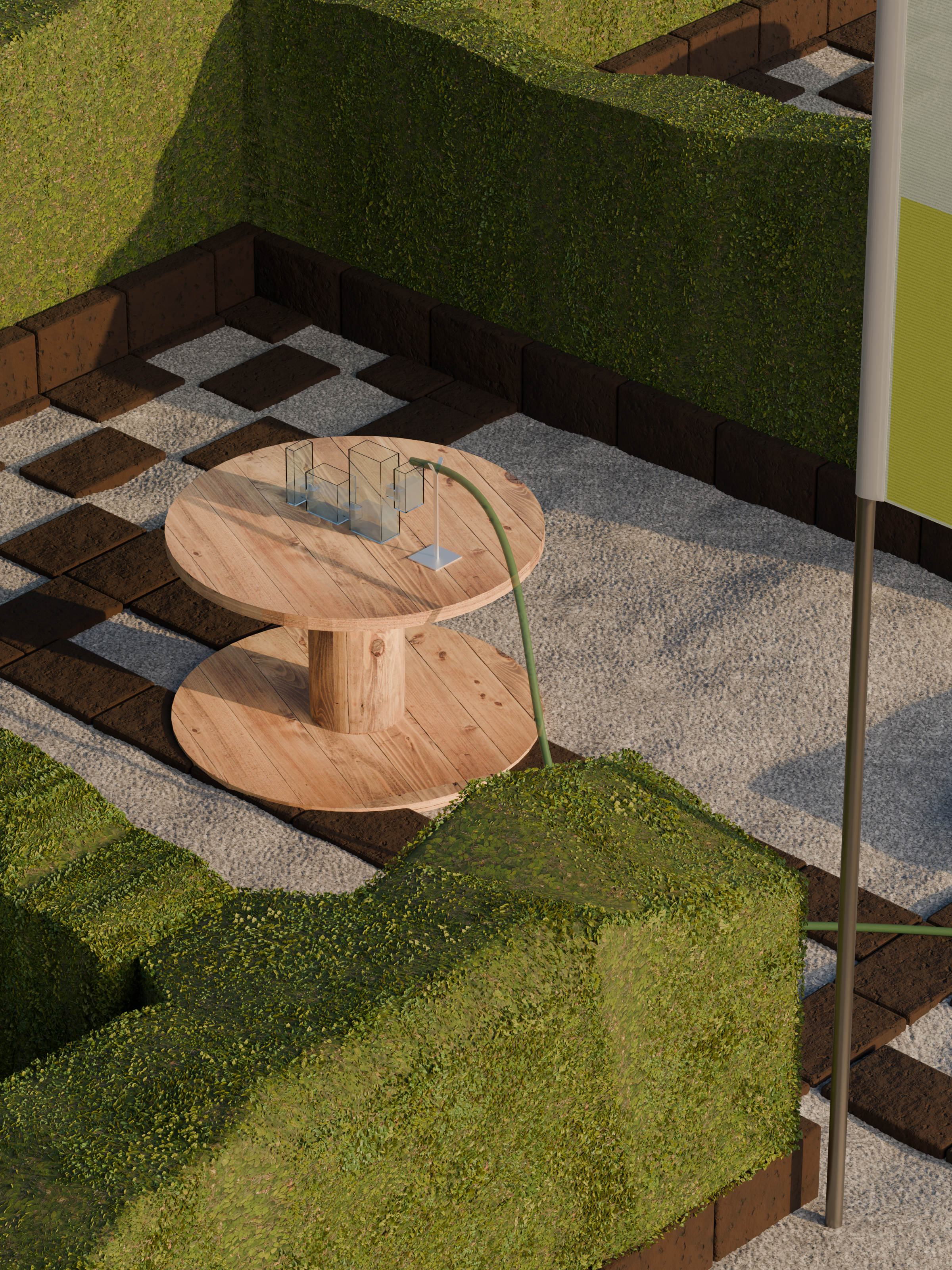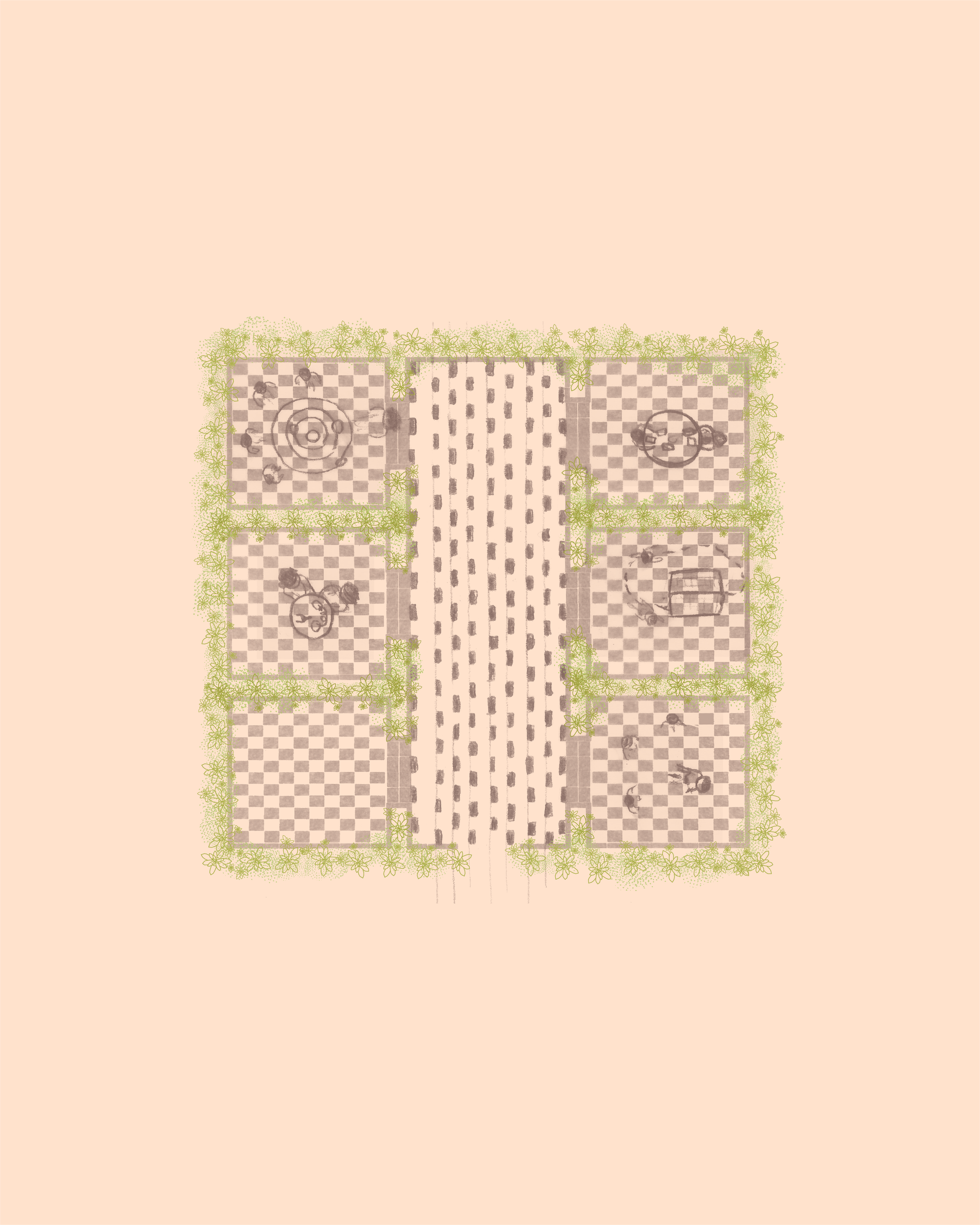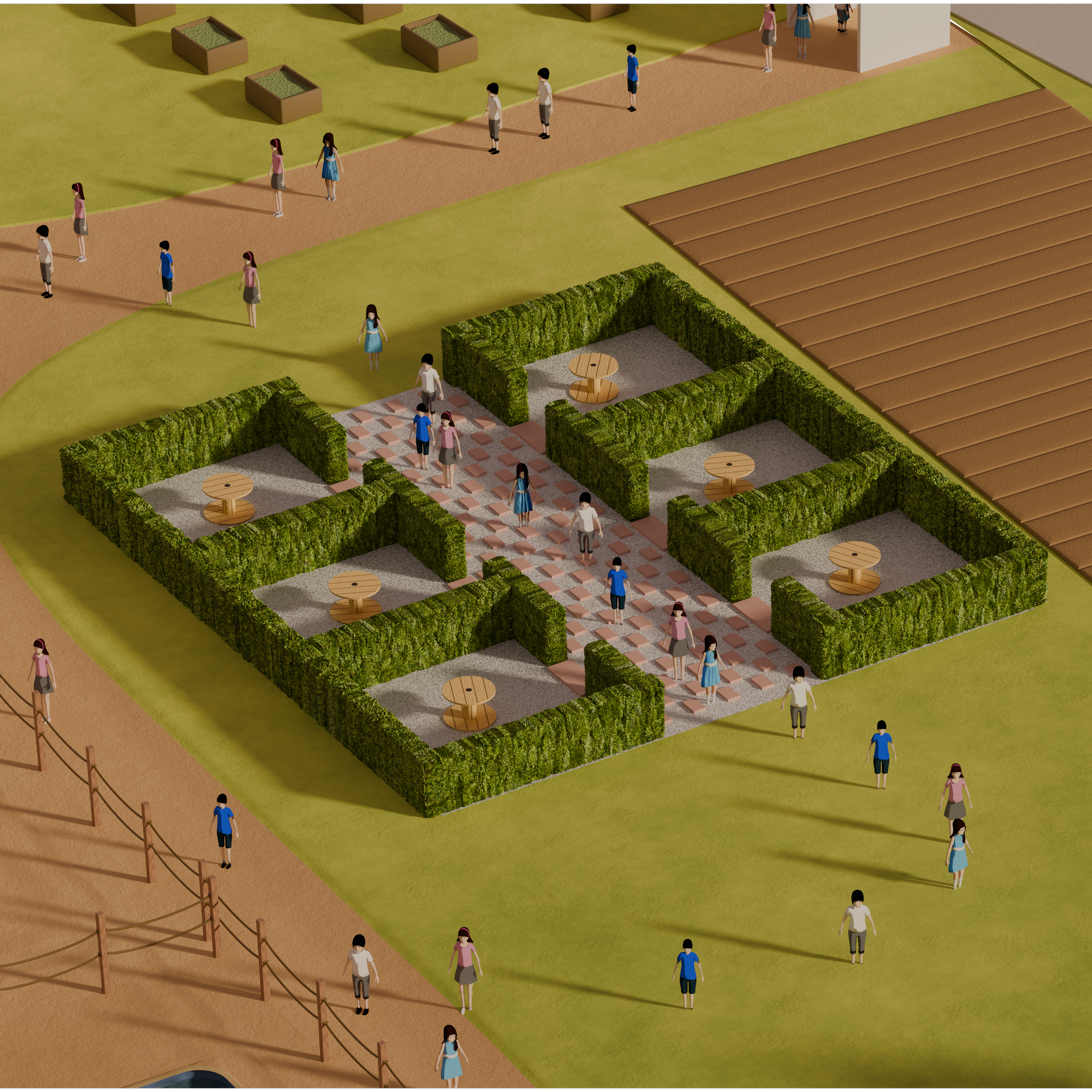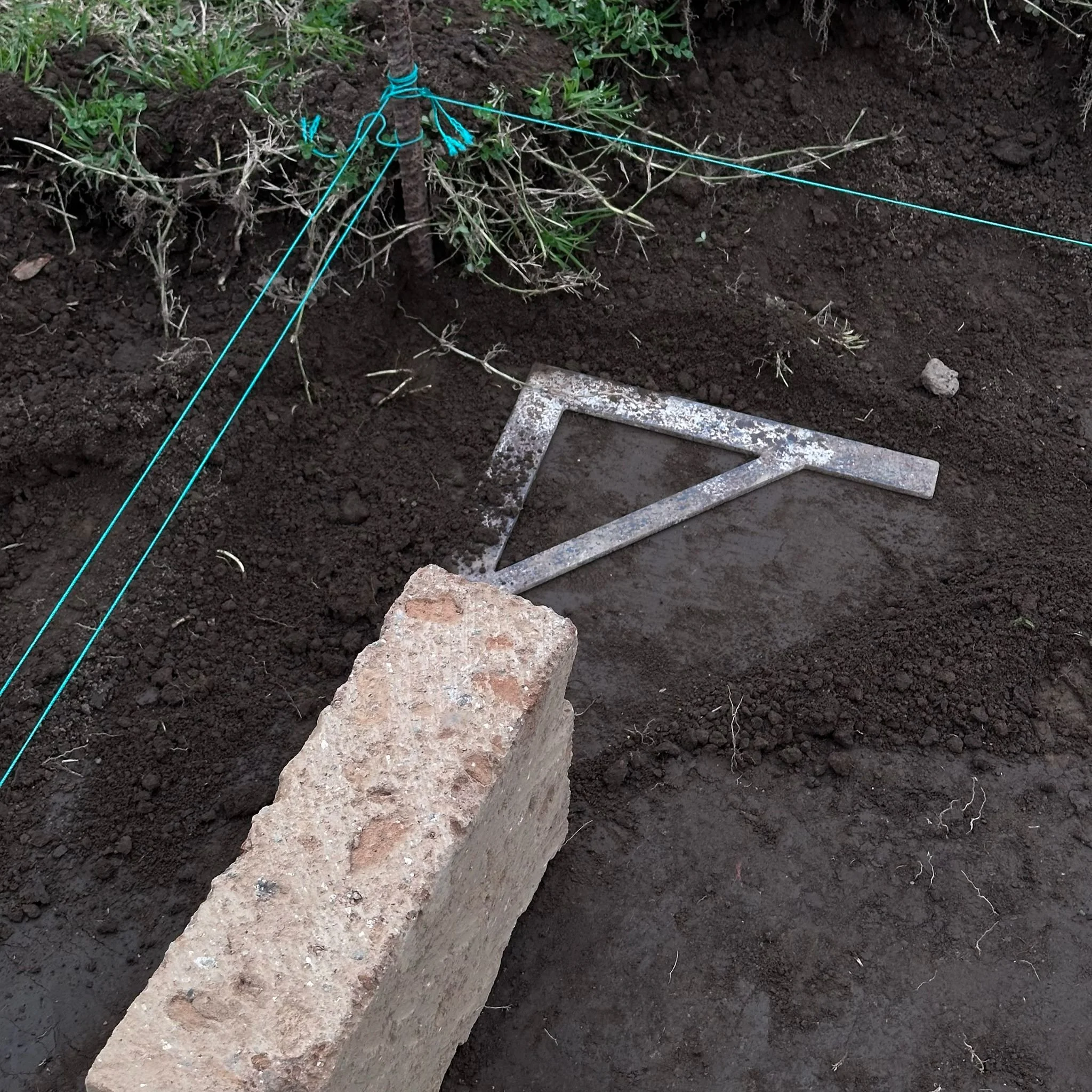 Dei mattoni di tufo posati a secco fungono da tracciato, disegnando sul terreno la piú semplice delle aree, un quadrato di 12 metri per lato; allo stesso modo delineiamo sei stanze interne, tre su un fianco e altre tre dall’altro, mentre al centro un largo corridoio non solo servirá da accesso alle stesse, ma consentirá a tutti di incontrarsi come durante una allegra ora di intervallo. L’unico limite saranno i 300 buxus che proteggeranno le lezioni una volta cresciuti !